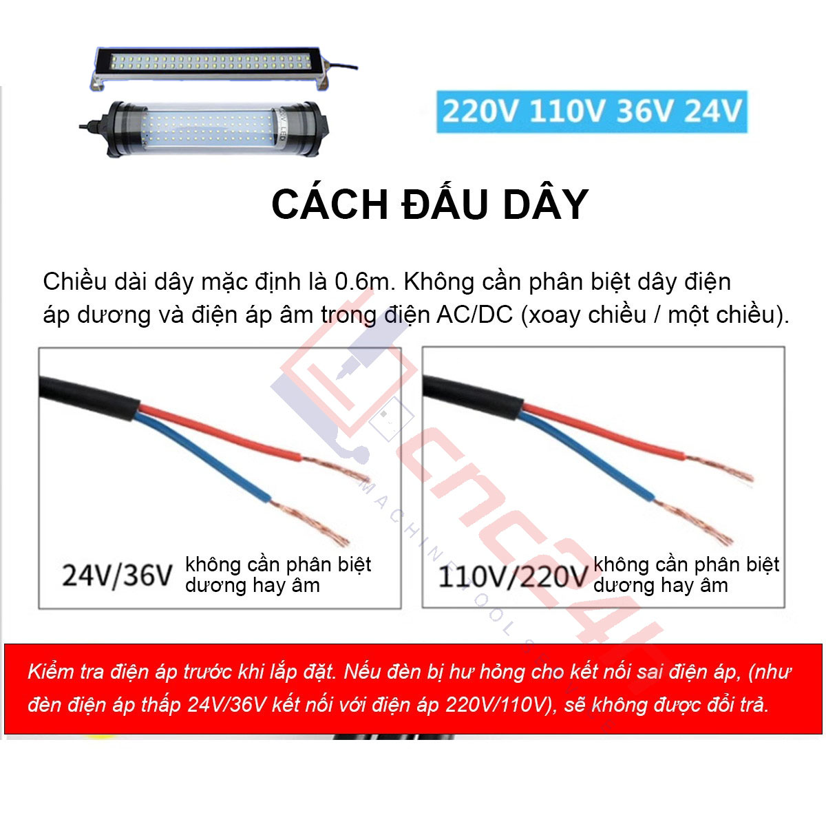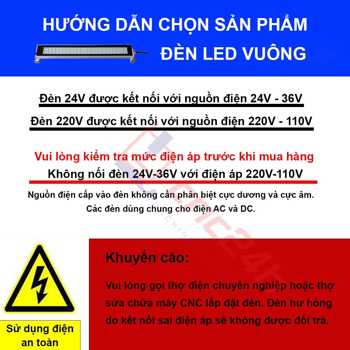 Điện áp sử dụng: cấp nguồn điện đúng loại đèn, đèn 24V-36V sử dụng điện 24V-36V (DC), đèn 110V-220V sử dụng điện 110V-220V (AC)